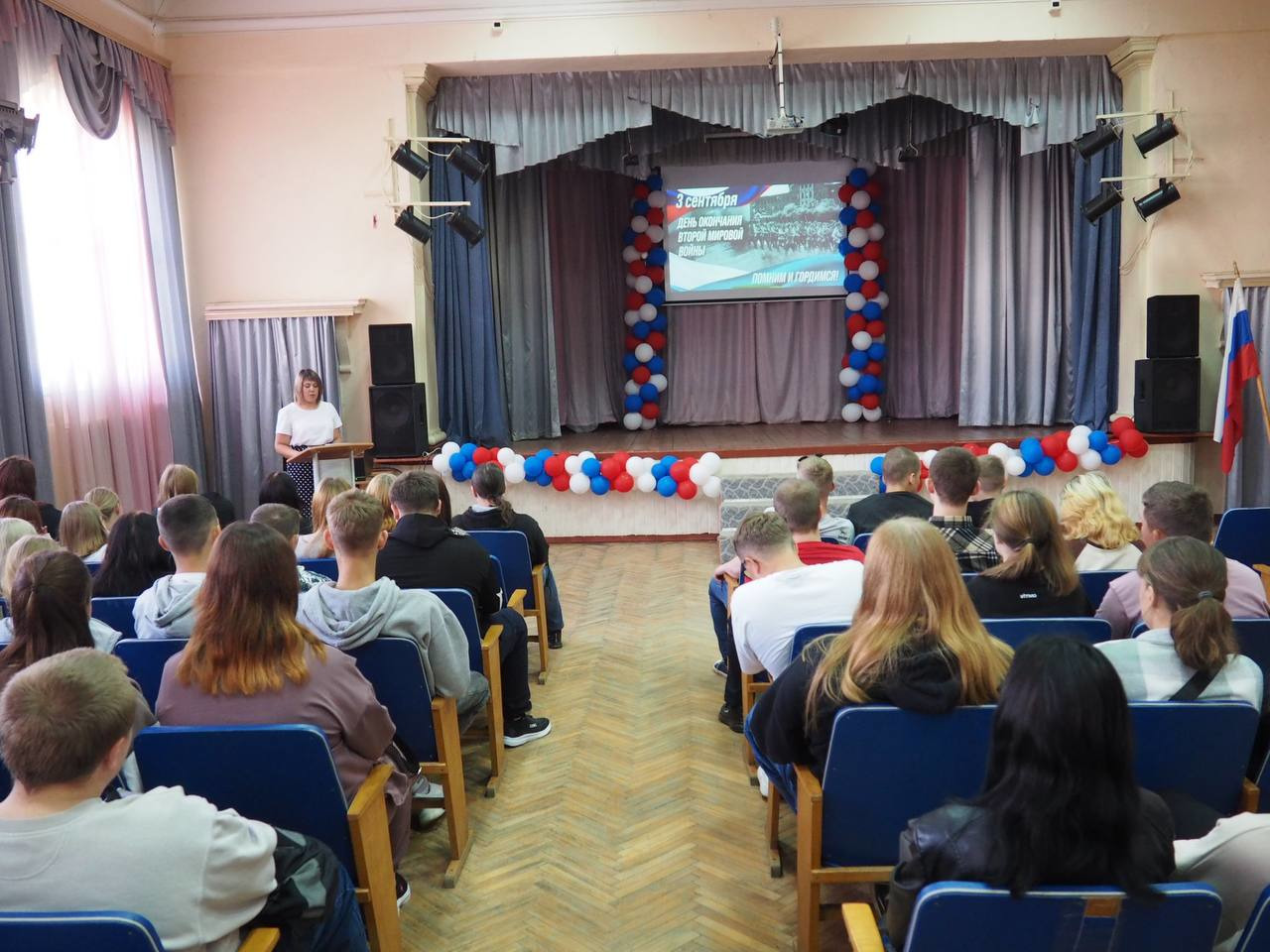 04.09.20234 сентября 2023 года советником директора по воспитанию и взаимодействию с детскими общественными объединениями ГБП ОУ «Торжокский государственный промышленно-гуманитарный колледж» был проведен классный час, посвященный памятной дате России – 3 сентября 1945 года – День окончания Второй мировой войны.