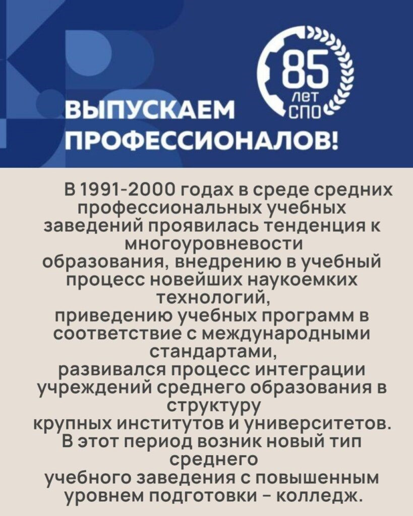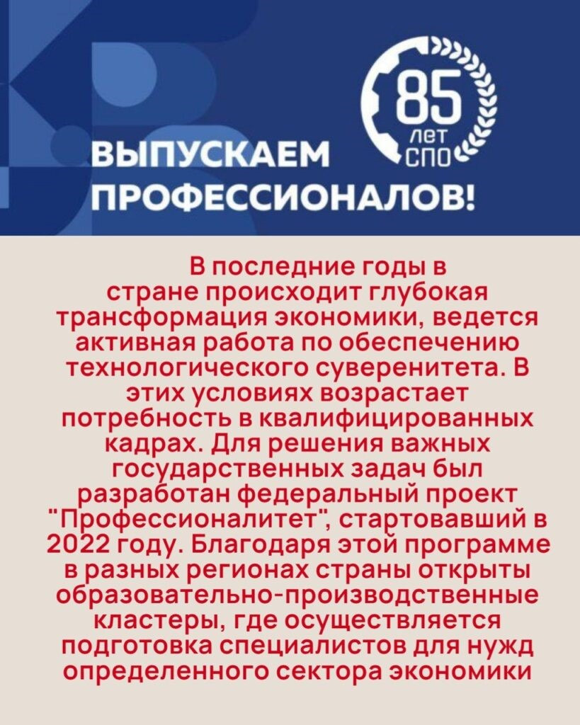 23.09.20252 октября 2025 года исполняется 85 лет со дня основания системы среднего профессионального образования (СПО) в России. Это значимое событие для миллионов граждан страны – студентов колледжей и техникумов, их преподавателей и наставников, выпускников, занятых в промышленности и социальной сфере. СПО объединяет поколения и служит опорой для устойчивого развития государства.
