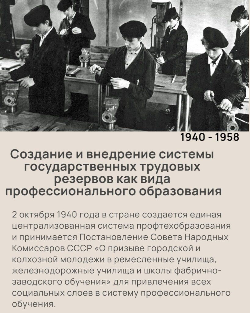 Система СПО доказала свою эффективность уже в годы Великой Отечественной войны, обеспечивая предприятия квалифицированными специалистами в условиях крайнего дефицита трудовых ресурсов. В послевоенные годы она сыграла важную роль в восстановлении экономики. В 2025 году юбилей СПО совпадает с еще одной знаковой датой – 80-летием Победы в Великой Отечественной войне, что подчеркивает тесную связь истории профобразования с героическими страницами прошлого страны.