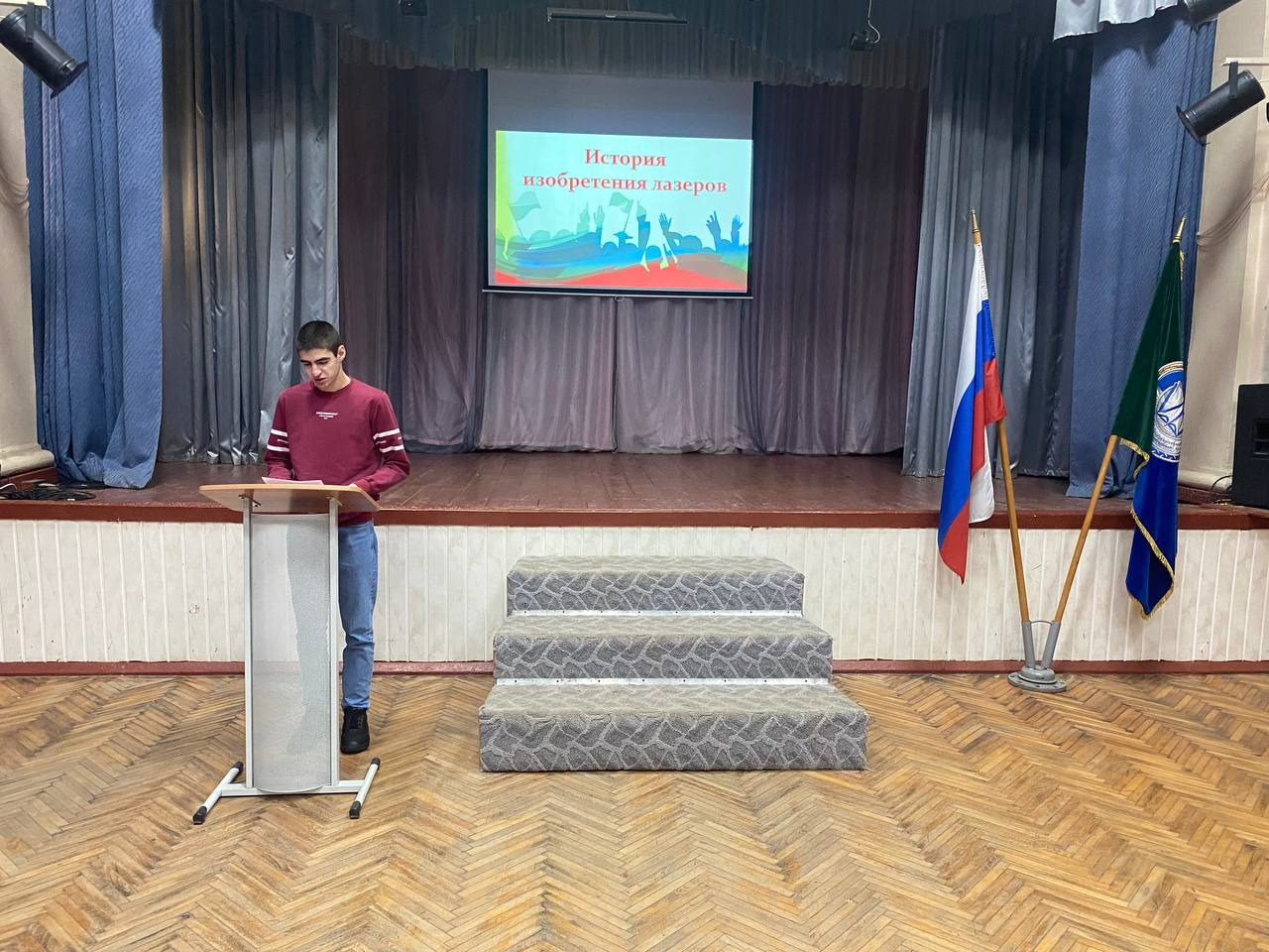 Студенты второго курса под руководством советника директора по воспитанию С.Ю.Бабуриной подготовили мероприятие, посвященное Дню российской науки. Были подготовлены сообщения об истории изобретения лазеров, истории мирного атома и термоядерного синтеза, истории отечественного авиастроения, история отечественной школы медицины. Все сообщения студентов сопровождались презентационными материалами.