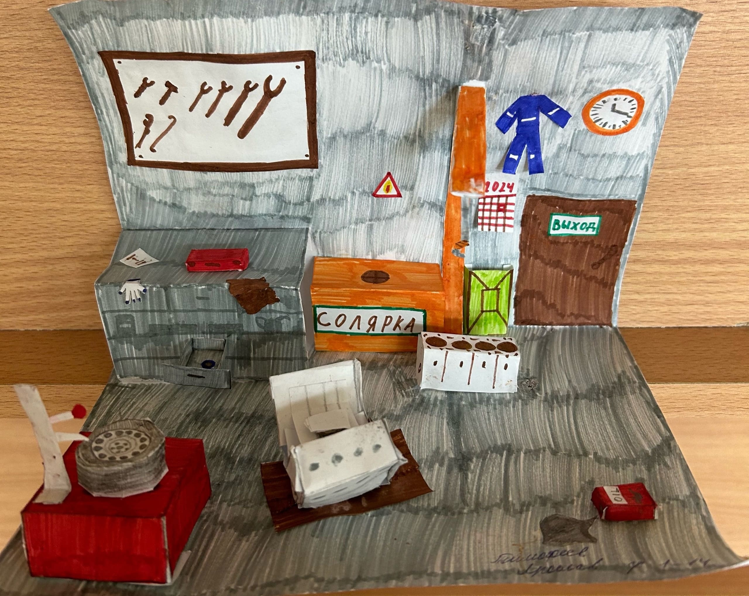 Ребята подошли к выполнению работ с энтузиазмом и креативом. Победитель конкурса, Тимофеев Ярослав использовал, как художественные навыки, так и объемную технику, выполнив макет ремонтной автомастерской.