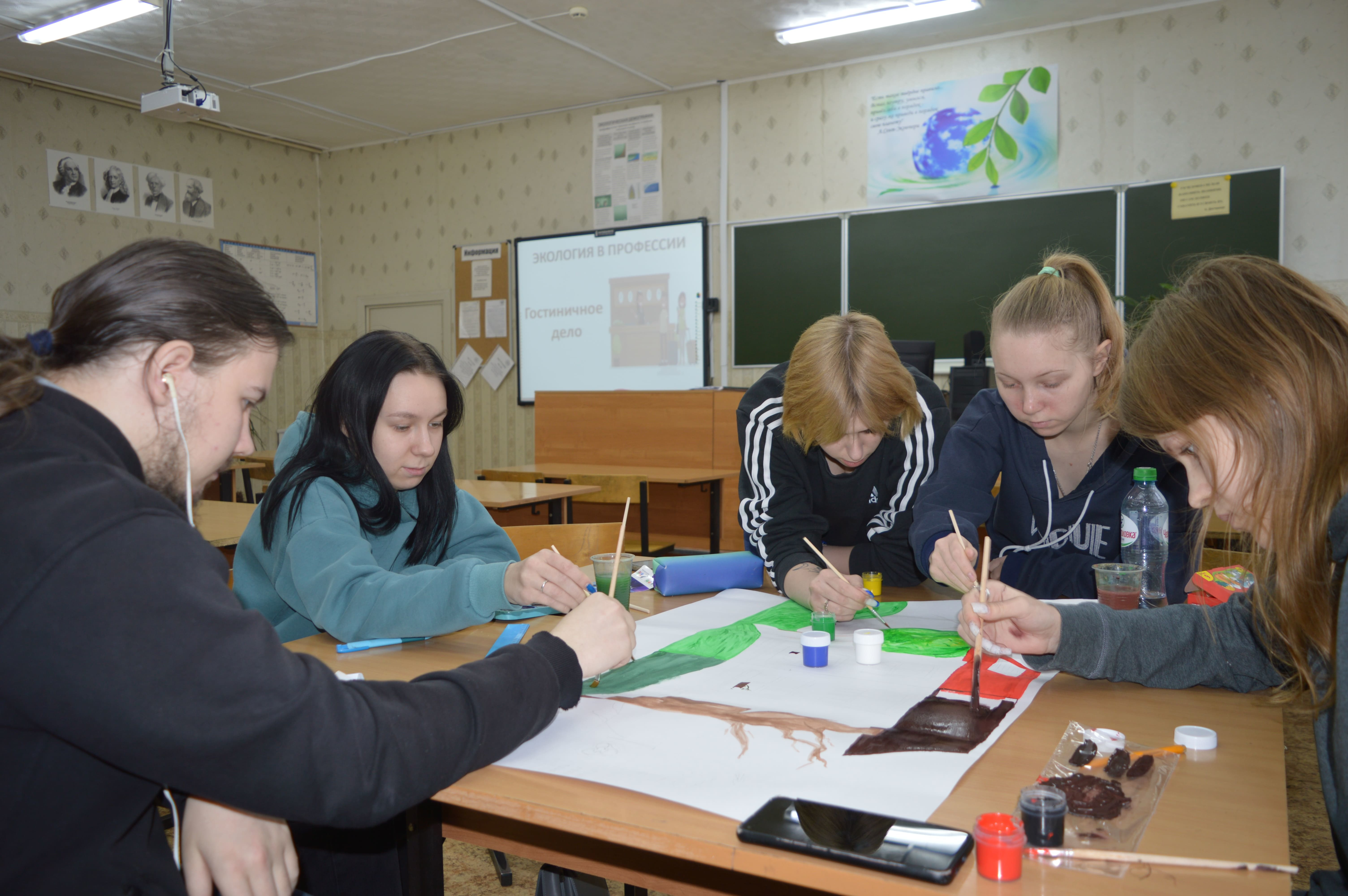 На уроке «Экология» студенты групп 2-13, 2-15 и 3-5 приняли активное участие в творческом проекте «Экология в профессии», где рисовали плакаты, на которых постарались показать значимость экологии в будущих профессиях и специальностях.
