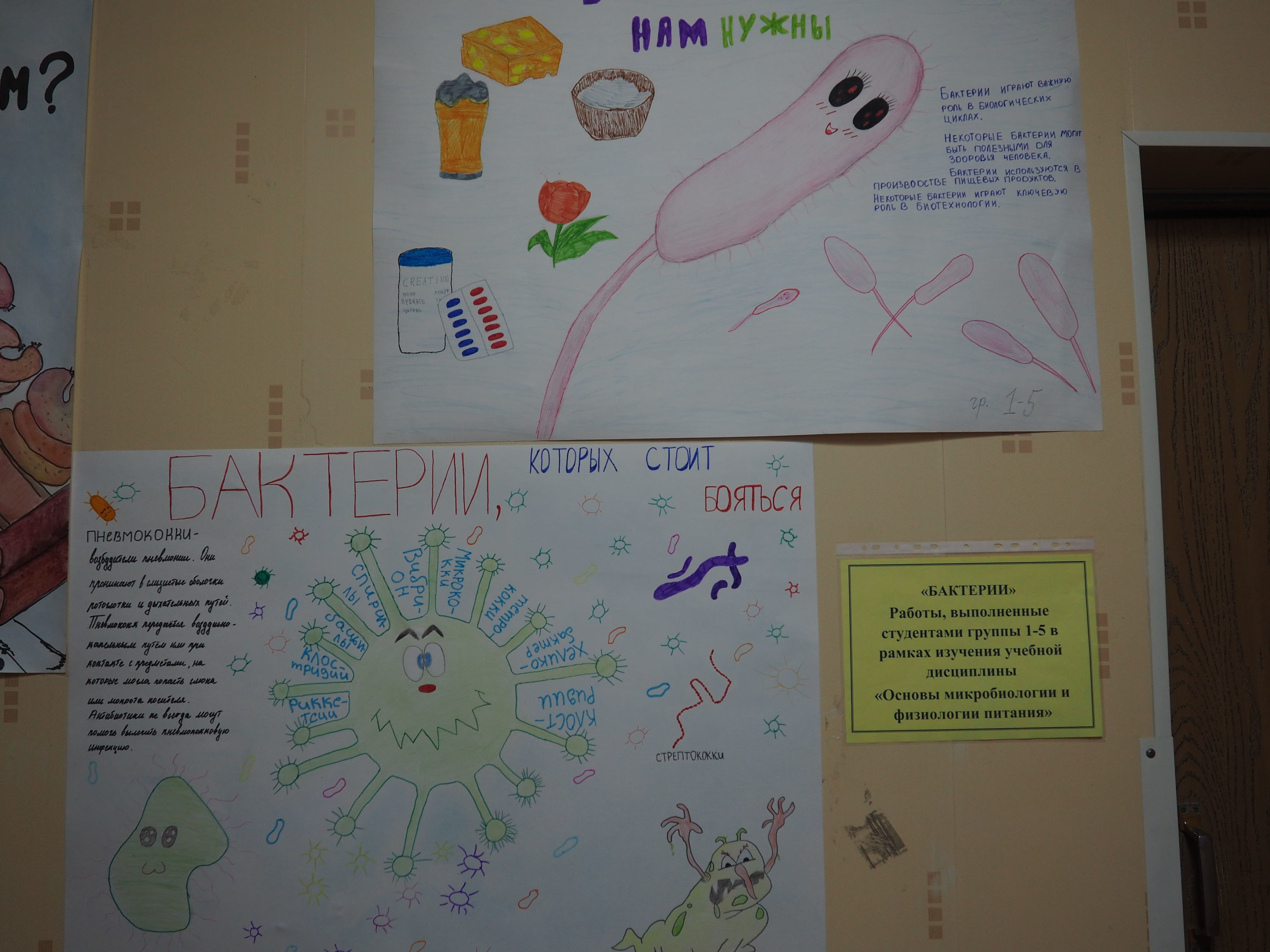 На уроке «Основы микробиологии и физиологии питания» студенты группы 1-5 приняли активное участие в творческом проекте “Хорошие и плохие бактерии”. На плакатах студенты постарались показать преимущества и недостатки микроорганизмов в осуществлении профессиональной деятельности повара, кондитера.