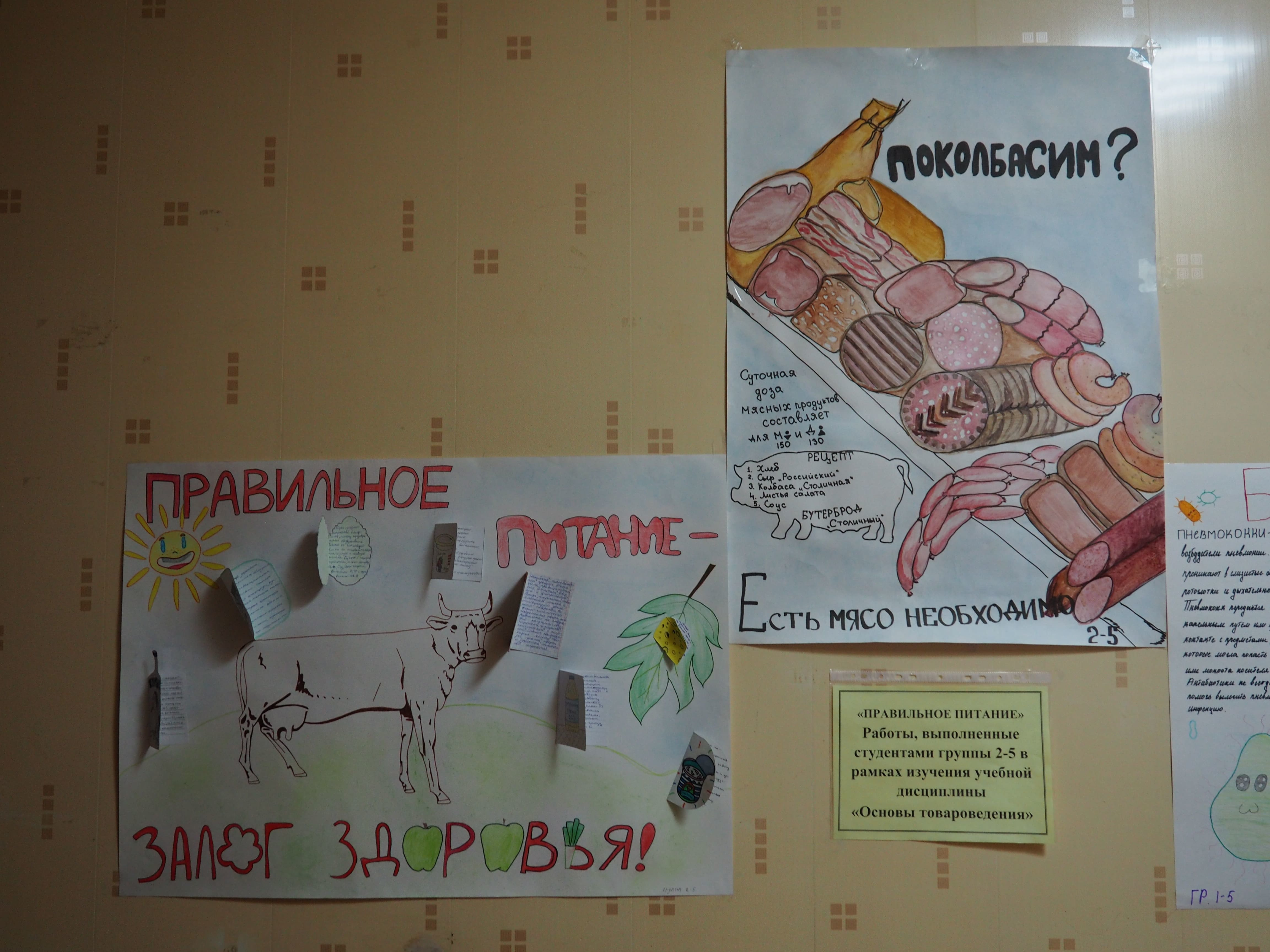 На уроке «Основы товароведения продовольственных товаров» студенты группы 2-5 приняли активное участие в творческом проекте “Молочные и колбасные изделия”. На плакатах ребята постарались показать достоинства данных продуктов при использовании их в будущей профессии «Повар, кондитер».