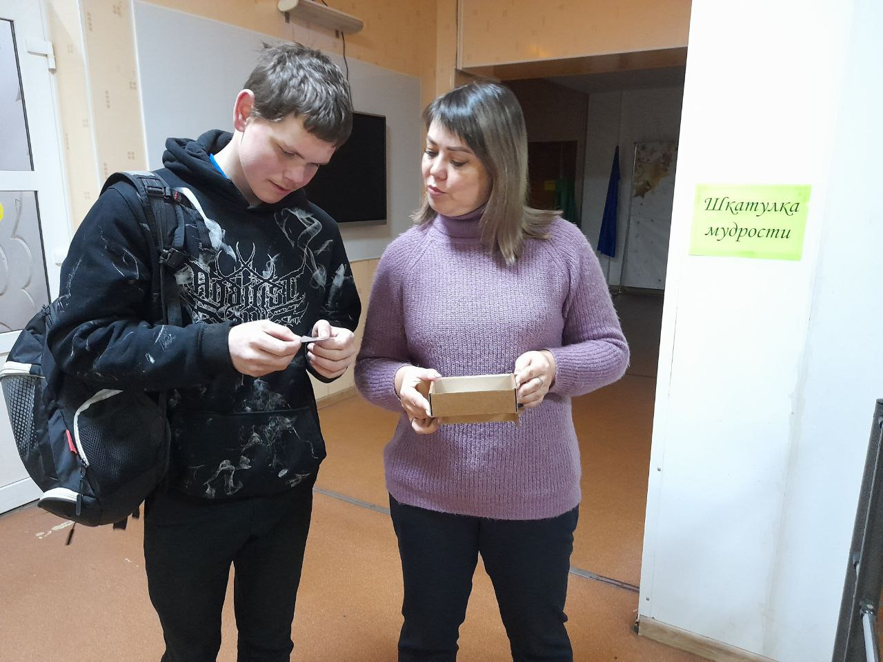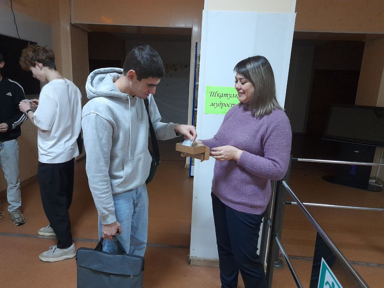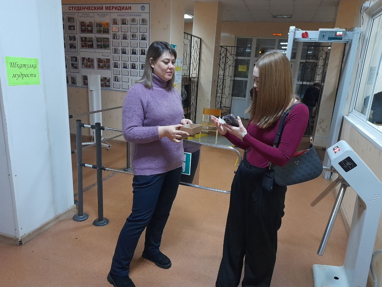 Группа энтузиастов предлагала всем достать из «Шкатулки мудростей» наугад листочек, свернутый в трубочку. Там – афоризм, совет или вдохновляющее высказывание с оптимистичным настроем! Это прекрасное доброе пожелание для студентов и преподавателей, чтобы с утра зарядиться позитивом и улыбками.