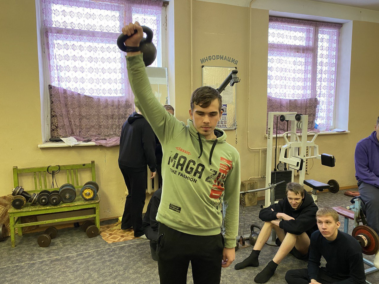 В программу соревнований входили такие виды как, сгибание разгибание рук в упоре лежа, приседания, жим гири 16 кг.